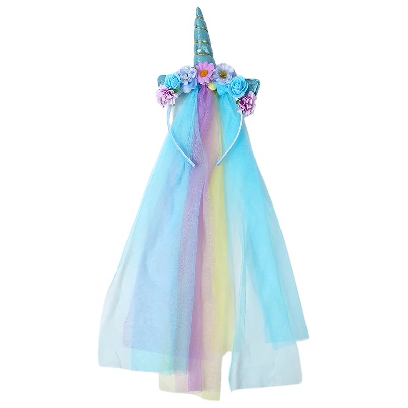 Offrez à votre enfant une touche de magie avec le bandeau licorne avec voile bleu céleste de Serre-Tête Avenue, un accessoire enchanteur qui stimule l’imagination et transforme chaque moment en une célébration féerique.